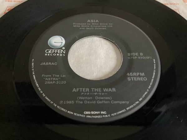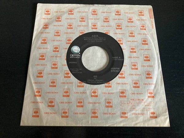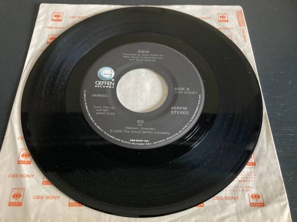 De single “Go / After The War” van Asia uit Japan, uitgebracht in 1985. Het gaat hier om de originele (eerste) release van de Japanse single met originele insert.