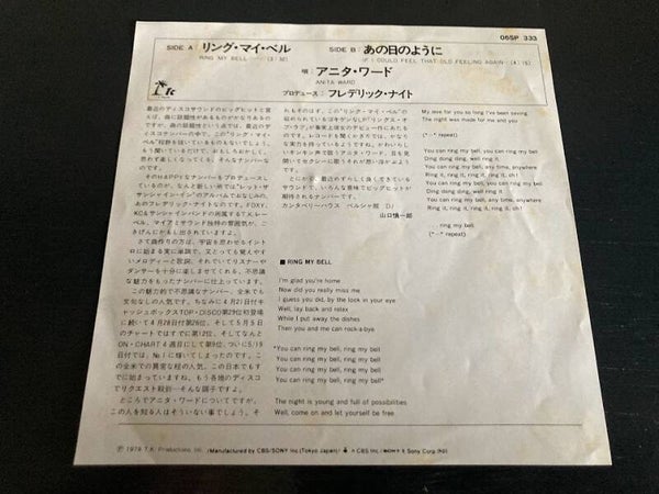De single “Ring My Bell / If I Could Feel That Old Feeling Again” van Anita Ward uit Japan, uitgebracht in 1979. Het gaat hier om de originele (eerste) release van de Japanse single met originele insert.