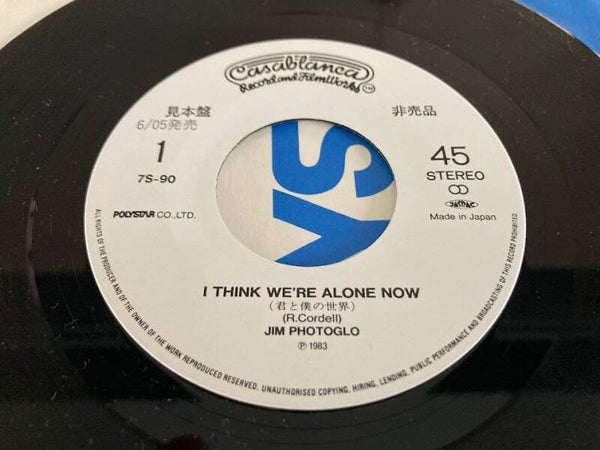De single “I Think We're Alone Now / You Need A Man” van Jim Photoglo uit Japan, uitgebracht in 1983. Het gaat hier om de promo, die niet te koop is geweest in de winkel. Op het label staan drie japanse tekens (zie fotos), deze betekenen ‘promo’.