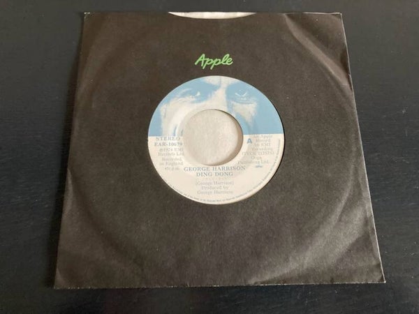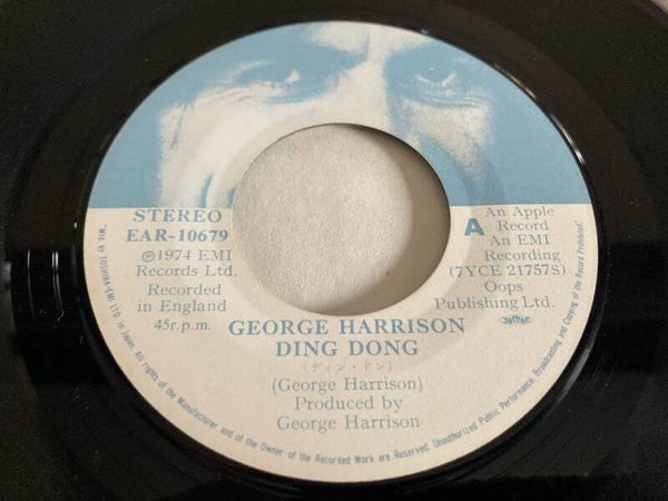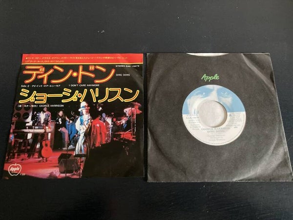 De single “Ding Dong / I Don’t Care Anymore” van George Harrison uit Japan, uitgebracht in 1974. Het gaat hier om de originele (eerste) release van de Japanse single met originele insert.