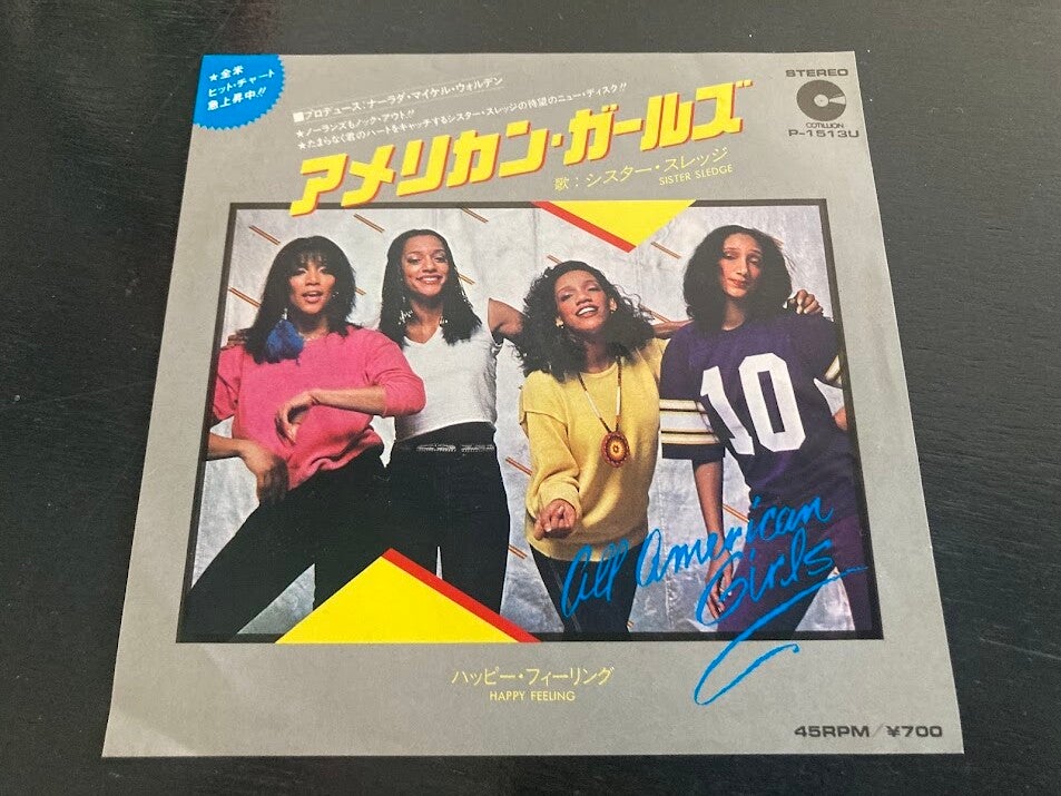 De single “All American Girls / Happy Feeling” van Sister Sledge uit Japan, uitgebracht in 1981. Het gaat hier om de originele (eerste) release van de Japanse single met originele insert.