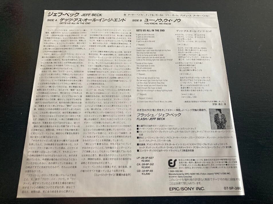 De single “Gets Us All In The End / You Know, We Know” van Jeff Beck uit Japan, uitgebracht in 1985. Het gaat hier om de originele (eerste) release van de Japanse single met originele insert.