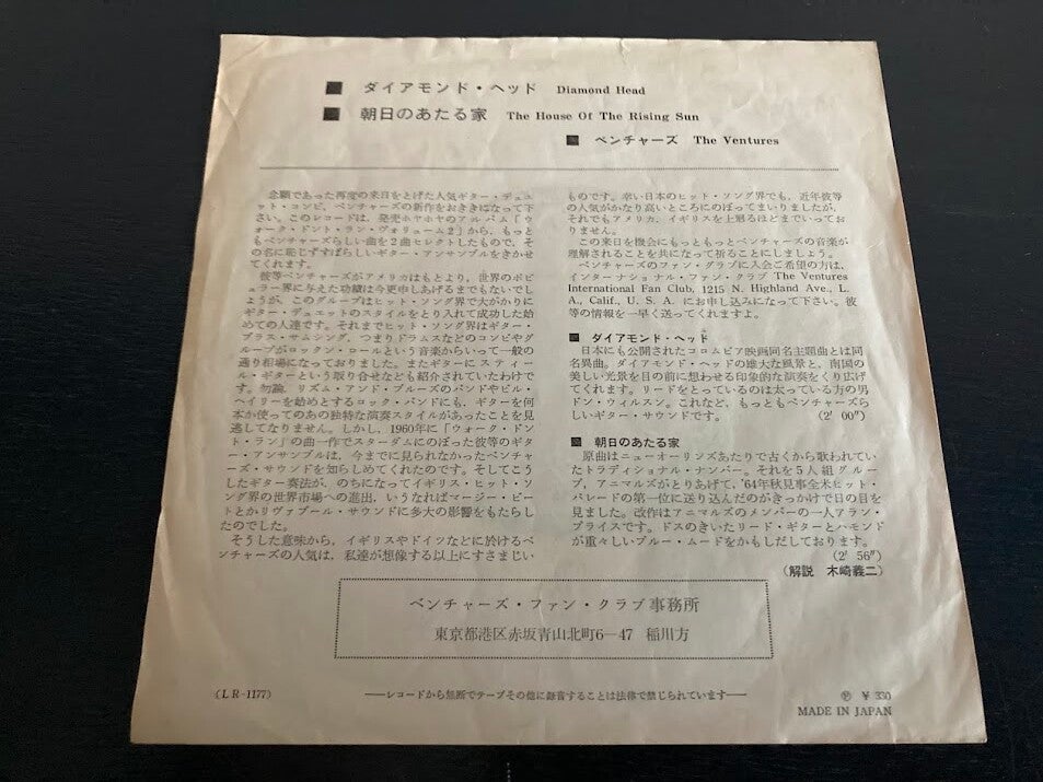 De single “Diamond Head / The House Of The Rising Sun” van The Ventures uit Japan. Het gaat hier om de originele (eerste) release van de Japanse single met originele insert, uitgebracht in 1965.