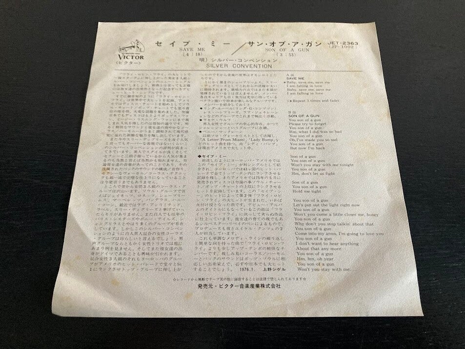 De single “Save Me / Son Of A Gun” van Silver Convention uit Japan. Het gaat hier om de originele (eerste) release van de Japanse single met originele insert, uitgebracht in 1976.