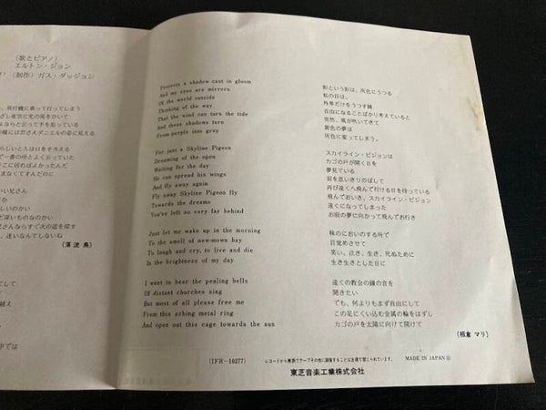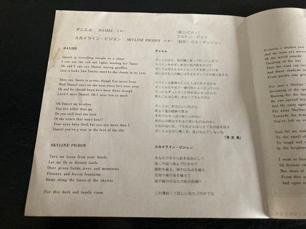 De single “Daniel / Skyline Pigeon” van Elton John uit Japan. Het gaat hier om de originele (eerste) release van de Japanse single met originele insert van vier pagina's, uitgebracht in 1972.
