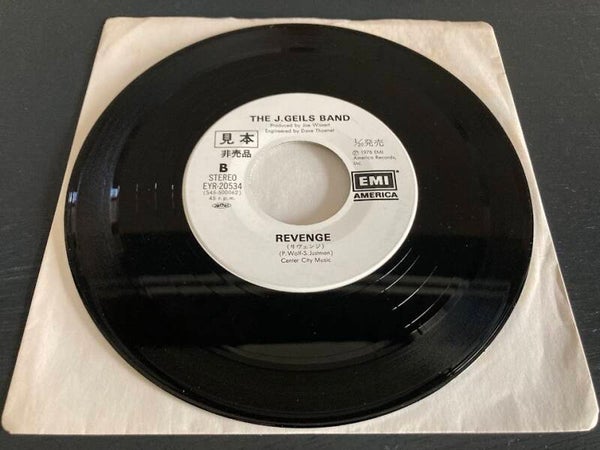 De single “One Last Kiss / Revenge” van J Geils Band uit Japan. Het gaat hier om de promo, die niet te koop is geweest in de winkel. Op het label staan drie japanse tekens (zie fotos), deze betekenen ‘promo’. Tevens is het label wit, anders dan de 'gewone' release. Deze promo is uitgebracht in 1978.