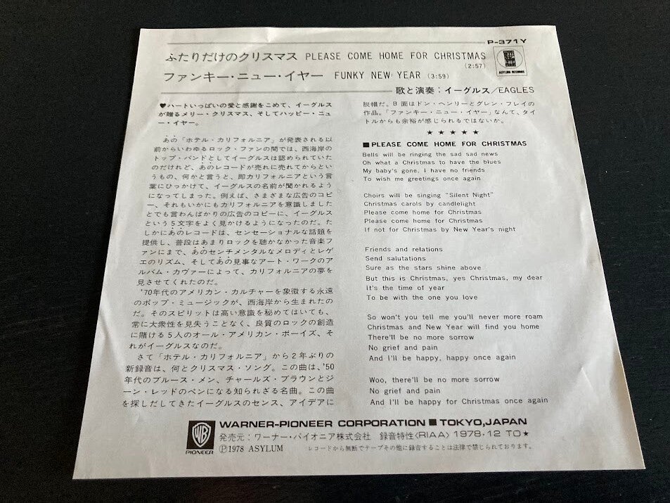 De single “Please Come Home For Christmas / ” van The Eagles uit Japan. Het gaat hier om de originele (eerste) release van de Japanse single met originele insert, uitgebracht in 1978.