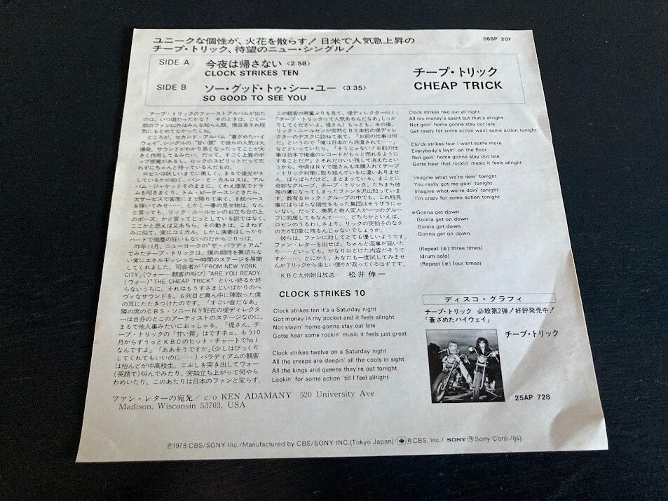 De single “Clock Strikes Ten / So Good To See You” van Cheap Trick uit Japan. Het gaat hier om de originele (eerste) release van de Japanse single met originele insert, uitgebracht in 1978.