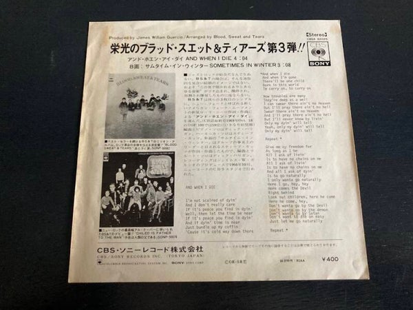 De single “And When I Die / Sometimes In Winter” van Blood, Sweat & Tears uit Japan. Het gaat hier om de originele (eerste) release van de Japanse single met originele insert, uitgebracht in 1969.