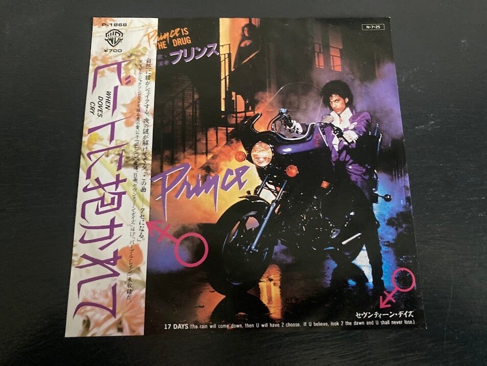 De single “When Doves Cry / 17 Days” van Prince uit Japan. Het gaat hier om de originele (eerste) release van de Japanse single met originele insert, uitgebracht in 1984.