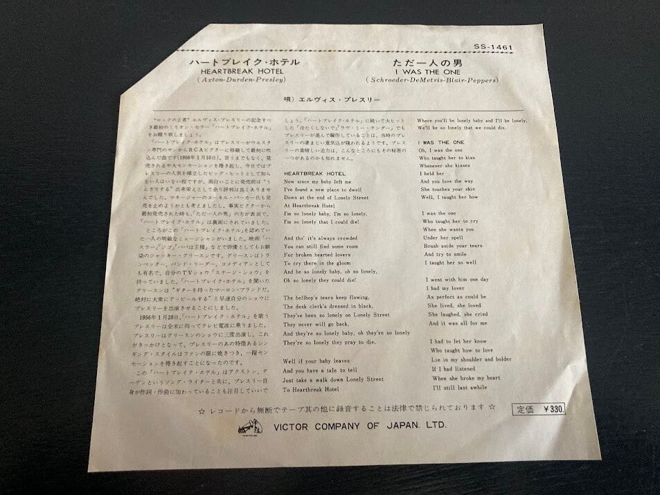 De single “Heartbreak Hotel / I Was The One” van Elvis Presley uit Japan. Het gaat hier om de originele (eerste) release van de Japanse single met originele insert, uitgebracht in 1956.