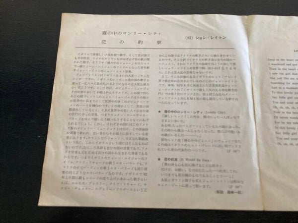 De single “Lonely City / It Would Be Easy” van John Leyton uit Japan. Het gaat hier om de originele (eerste) release van de Japanse single met originele insert van vier pagina's, uitgebracht in 1962.