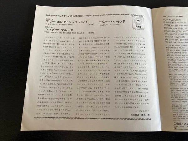De single “The Free Electric Band / You Taught Me To Sing The Blues” van Albert Hammond uit Japan. Het gaat hier om de promo, die niet te koop is geweest in de winkel. Op het label staan drie japanse tekens (zie fotos), deze betekenen ‘promo’. Deze single met originele insert van vier pagina's is uitgebracht in 1973.