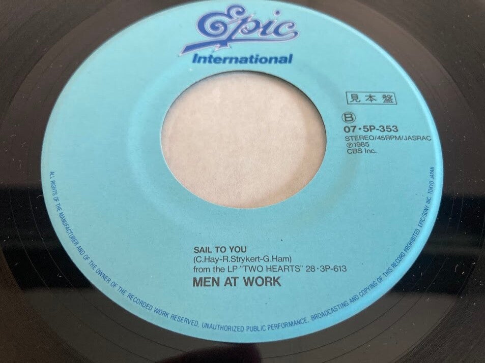 De single “Everything I Need / Sail To You” van Men At Work uit Japan. Het gaat hier om de promo, die niet te koop is geweest in de winkel. Op het label staan drie japanse tekens (zie fotos), deze betekenen ‘promo’. Deze promo is uitgebracht in 1985.
