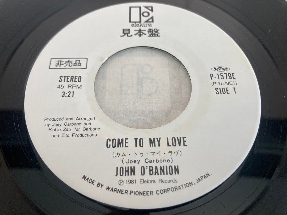 De single “Come To My Love / Our Love Can Make It” van John O'Banion uit Japan. Het gaat hier om de promo, die niet te koop is geweest in de winkel. Op het label staan drie japanse tekens (zie fotos), deze betekenen ‘promo’. Tevens is het label wit, anders dan de 'gewone' release. Deze promo is uitgebracht in 1981.