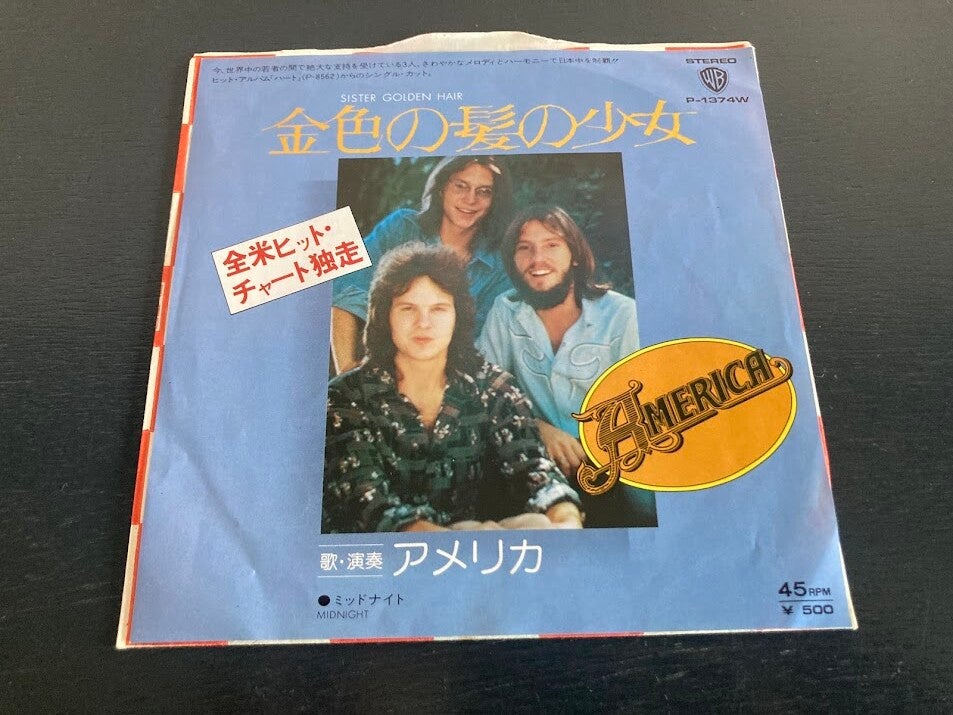 De single “Sister Golden Hair / Midnight” van America uit Japan. Het gaat hier om de originele (eerste) release van de Japanse single met originele insert, uitgebracht in 1975.