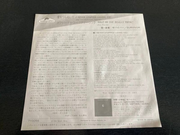 De single “I Never Stopped Loving You / What Do You Really Think?” van Survivor uit Japan. Het gaat hier om de promo, die niet te koop is geweest in de winkel. Op het label staan drie japanse tekens (zie fotos), deze betekenen ‘promo’. Met originele insert, uitgebracht in 1984.