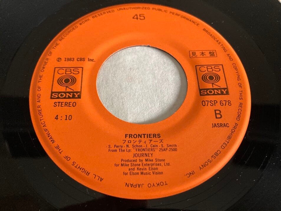 De single “Separate Ways / Frontiers” van Journey uit Japan. Het gaat hier om de promo, die niet te koop is geweest in de winkel. Op het label staan drie japanse tekens (zie fotos), deze betekenen ‘promo’. Met originele insert, uitgebracht in 1983.