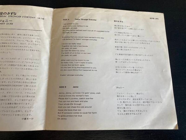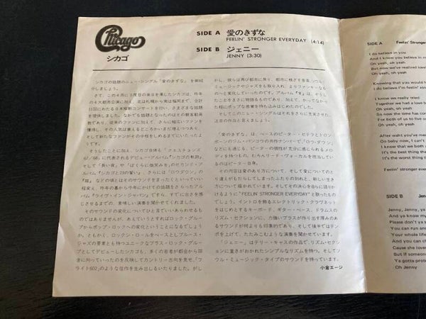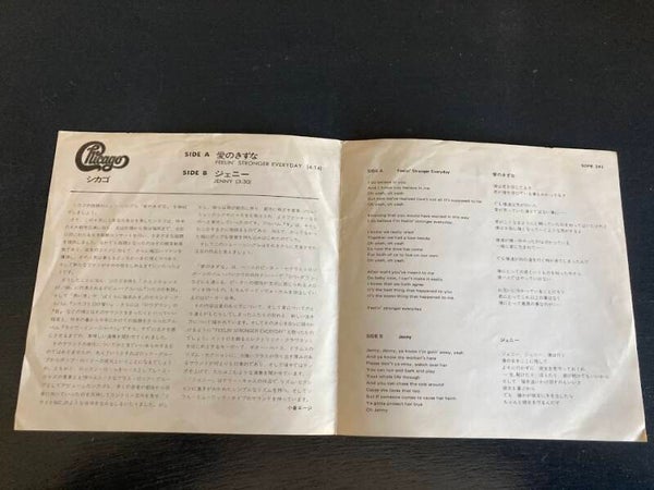 De single “Feeling Stronger Every Day / Jenny” van Chicago uit Japan. Het gaat hier om de originele (eerste) release van de Japanse single met originele insert van vier pagina's, uitgebracht in 1973.