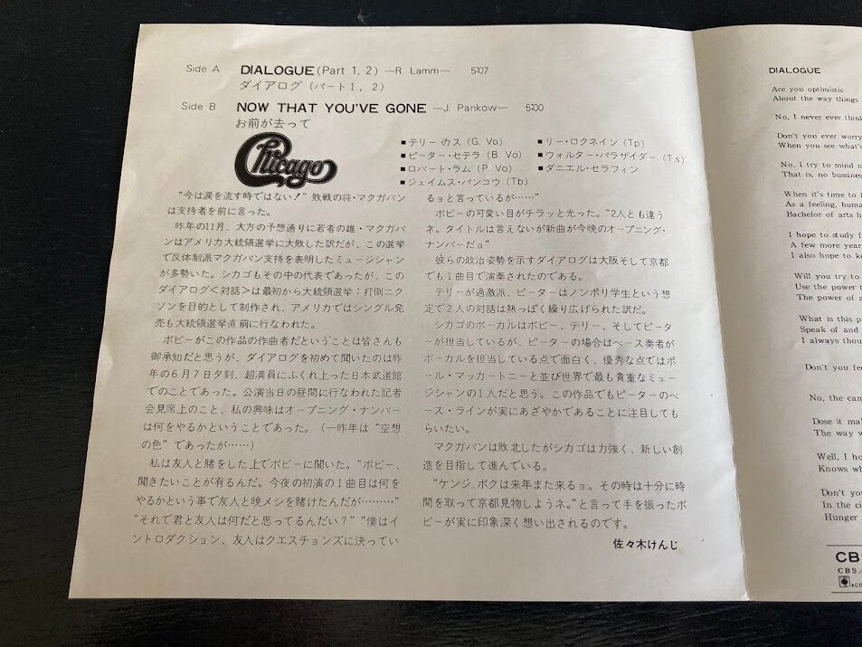 De single “Dialogue (part 1, 2) / Now That You've Gone” van Chicago uit Japan. Het gaat hier om de originele (eerste) release van de Japanse single met originele insert van vier pagina's, uitgebracht in 1972.