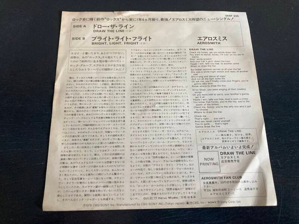 De single “Draw The Line / Bright, Light, Fright” van Aerosmith uit Japan. Het gaat hier om de originele (eerste) release van de Japanse single met originele insert, uitgebracht in 1977.