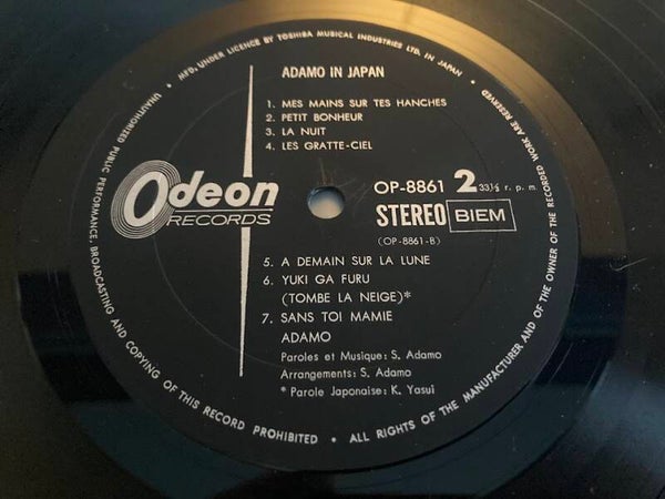 Het album “Adamo In Japan” van Adamo uit Japan met OBI, antwoordkaart en 2 inserts, uitgebracht in 1970.