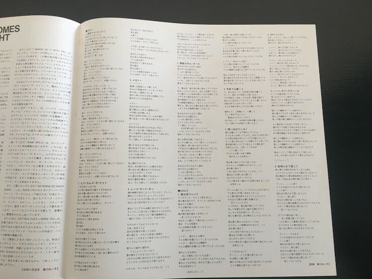 Het album “Here Comes The Night” van Barry Manilow uit Japan met OBI en insert. De hoes ziet er zeer goed uit, de OBI zit om de hoes heen en is in perfecte staat. De OBI zit niet aan de hoes zelf vast dus kan verschoven worden. Op de hoes zitten hier en daar wat vlekken, deze zitten ook op de insert. In de hoes zit een insert van twee pagina’s met de songteksten in het engels en het japans. Binnenin de insert staat nog info in het japans. De insert is nog in goede staat maar er zitten wel vlekken op. Het vinyl zit in een plastic innersleeve en ziet er nog zeer goed uit.