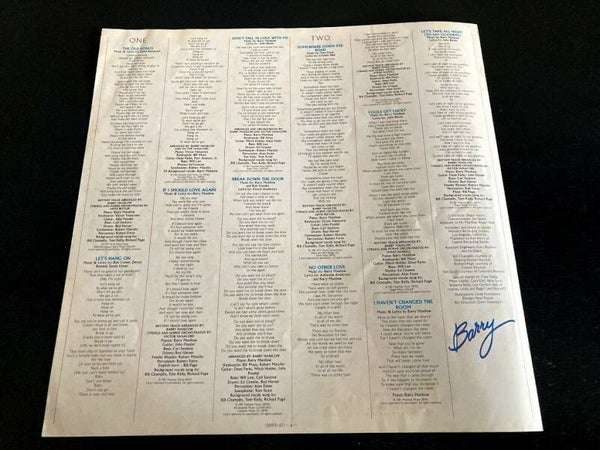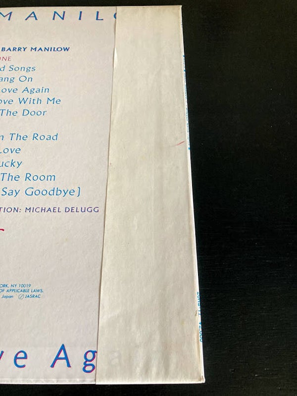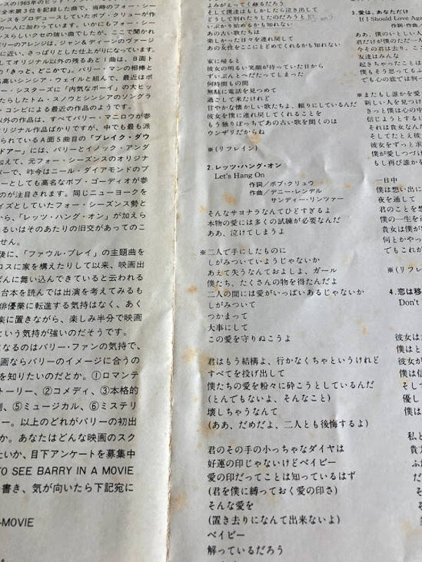 In de hoes zit een insert van vier pagina’s met info over Barry Manilow in het japans plus alle songteksten in het engels en in het japans. Deze insert heeft bruine vlekken (zie fotos) ziet er verder nog goed uit.