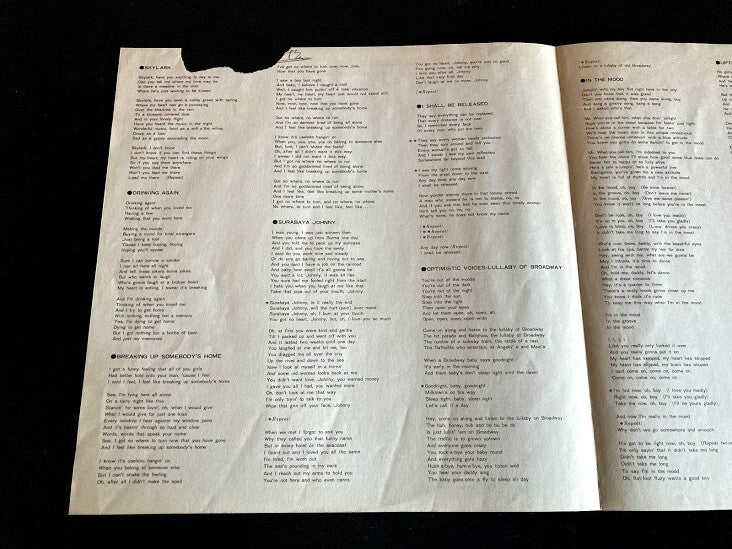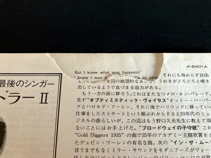 Het album “Bette Midler” van Bette Midler uit Japan met OBI en insert. De hoes heeft wat verkleuringen langs de randen van de hoes maar ziet er verder nog goed uit. De OBI zit om de hoes heen en zit niet aan de hoes vast. De OBI is ook een beetje verkleurd en heeft hele kleine scheurtjes aan de linkerkant. In de hoes zit een insert van vier pagina’s met info over Bette Midler in het japans en de songteksten in het engels. De insert is ook wat verkleurd en er is een stuk uitgescheurd (zie fotos) maar ziet er verder nog erg goed uit. Het vinyl zit een plastic innersleeve en ziet er ook nog perfect uit.