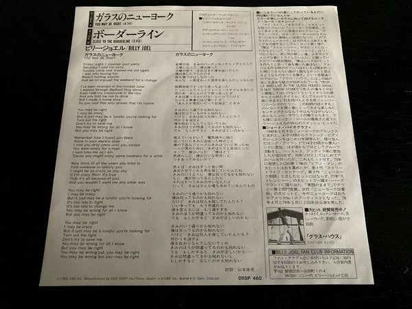 De single “You May Be Right / Close To The Border Line” van Billy Joel uit japan, uitgebracht in 1980. Het gaat hier om de originele (eerste) release van de japanse single met originele insert. Origineel zit in de innersleeve een insert met de voorkant hoes van de single. De insert zit nu voor de innersleeve in een plastic hoes. Op de voorkant van de insert staat de voorkant van de hoes, en op de achterkant van de insert staat info over Billy Joel in het japans plus de songtekst van You May Be Right in het engels en in het japans. De insert ziet er nog perfect uit. De single zelf zit in de originele innersleeve. Het vinyl ziet er nog perfect uit.