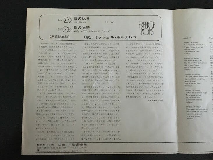 De single “Holidays / Nos, Mots D'amour” van Michel Polnareff uit Japan. Uitgebracht in 1972. Het gaat hier om de originele (eerste) release van de japanse single met originele insert (van 2 pagina’s) en innersleeve. Origineel zit in de innersleeve een insert met de voorkant hoes van de single. De insert zit nu voor de innersleeve in een plastic hoes. Op de voorkant van de insert staat de voorkant van de hoes, aan de binnenkant van de insert staan de songteksten van Holidays en Nos, Mots D’amour in het engels (en frans) en in het japans. De insert ziet er nog perfect uit. De innersleeve en het vinyl zien er ook nog perfect uit.
