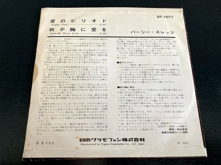 De single “Sudden Stop / Between These Arms” van Percy Sledge uit Japan, uitgebracht in 1968. Het gaat hier om de originele (eerste) release van de Japanse single met fotohoes en insert. De fotohoes heeft bruine vlekken aan de achterkant (zie fotos) maar ziet er verder nog zeer goed uit. Op de insert staan de songteksten van Sudden Stop en Between These Arms in het engels. De insert ziet er nog perfect uit. De single zelf zit los in de hoes. Het vinyl ziet er nog zeer goed uit.
