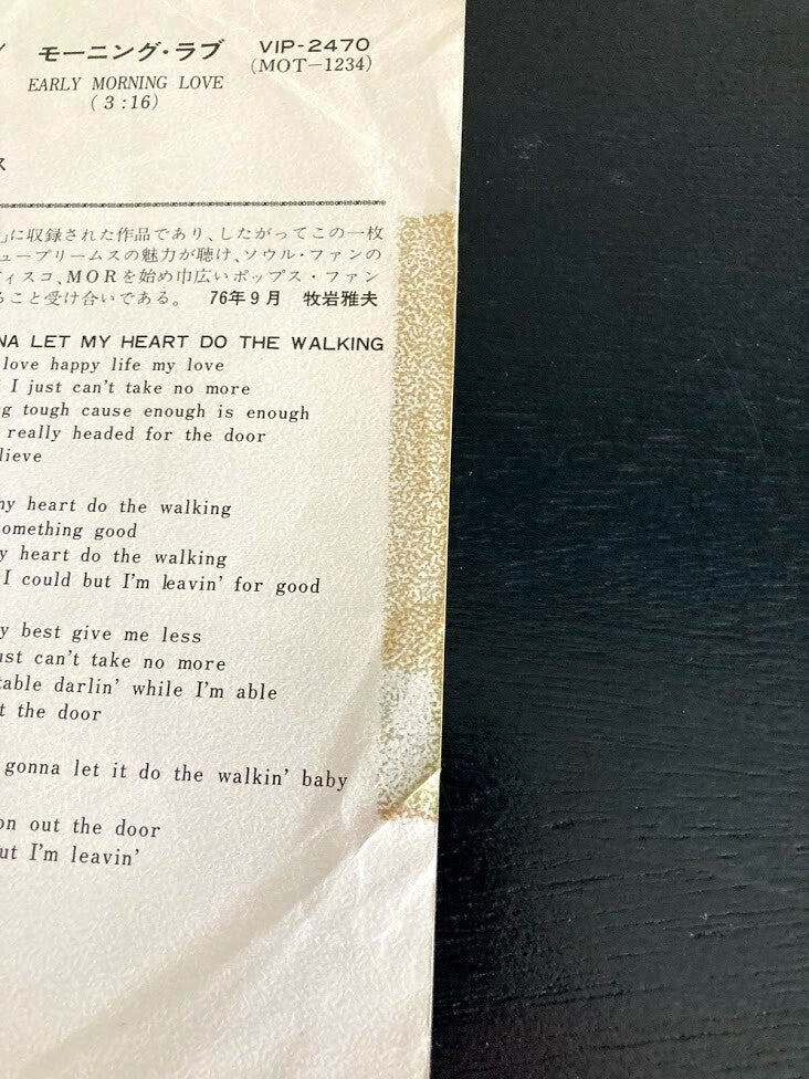 De single “I’m Gonna Let My Heart Do The Walking / Early Morning Love” van The Supremes uit Japan, uitgebracht in 1976. Het gaat hier om de promo versie van deze release van de Japanse single met originele insert. Op het label staan drie tekens, deze betekenen ‘promo’ tevens is het label wit gekleurd, anders dan de gewone release van deze single.