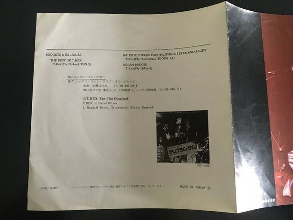 De single “Metal Guru / Lady” van T. Rex uit Japan, uitgebracht in 1972. Het gaat hier om de originele (eerste) release van de japanse single met originele insert (van 3 pagina’s) en innersleeve. Origineel zit in de innersleeve een insert met de voorkant hoes van de single. De insert zit nu voor de innersleeve in een plastic hoes. Op de voorkant van de insert staat de voorkant van de hoes, aan de binnenkant van de insert staat de songtekst van Metal Guru in het engels en in het japans, de songtekst van Lady in het engels plus info over T. Rex en Marc Bolan in het japans. De insert ziet er nog perfect uit. De innersleeve en het vinyl zien er ook nog perfect uit.