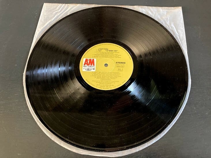 Het verzamelalbum “Super Max 20” van The Carpenters uit Japan met OBI en insert, uitgebracht in 1973. Deze ‘Super Max 20’ verzamelalbums werden alleen in japan uitgebracht. De hoes heeft vlekken aan de voor, binnen en achterzijde (zie fotos), het goud op de voorkant glimt nog mooi, de hoes ziet er verder nog goed uit. De OBI zit om de hoes heen en zit niet aan de hoes vast. De OBI heeft vlekken aan de achterkant maar ziet er verder nog goed uit. Aan de binnenkant van de hoes zit een rode innersleeve vast gemaakt. Achter deze innersleeve zit een insert, deze is ook in de hoes vastgemaakt. De insert heeft net als de hoes veel bruine plekken maar ziet er verder nog goed uit. Het vinyl zit een plastic innersleeve en ziet er nog zeer goed uit.