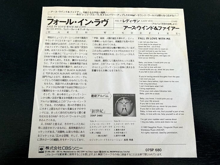 De single “Fall In Love With Me / Lady Sun” van Earth, Wind & Fire uit Japan, uitgebracht in 1982. Het gaat hier om de originele (eerste) release van de Japanse single met originele insert.