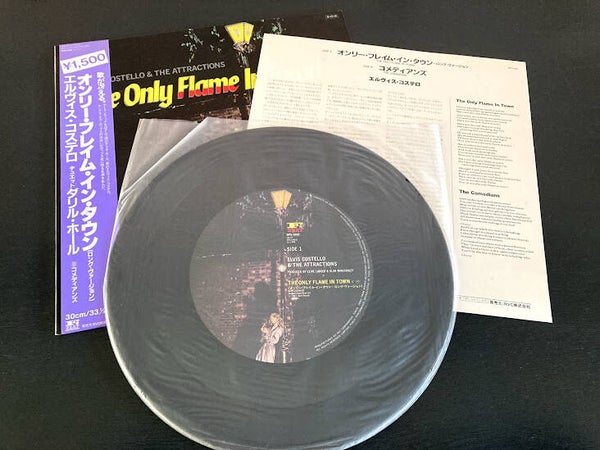 De 12” maxi single “The Only Flame In Town” van Elvis Costello uit Japan met OBI en insert, uitgebracht in 1984.