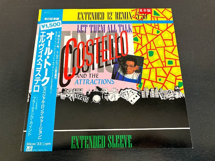 De 12” maxi single “Let Them All Talk” van Elvis Costello uit Japan met OBI en insert, uitgebracht in 1984.