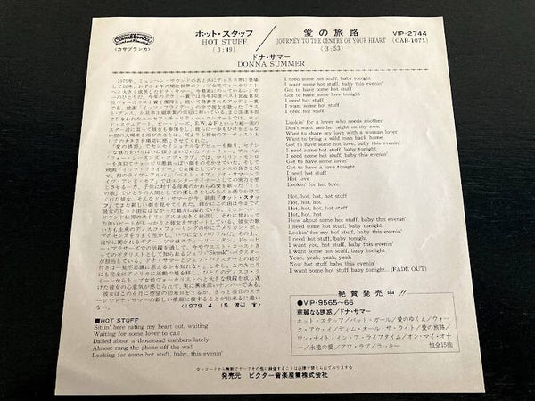 De single “Hot Stuff / Journey To The Centre Of Your Heart” van Donna Summer uit Japan, uitgebracht in 1979. Het gaat hier om de originele (eerste) release van de Japanse single met originele insert.