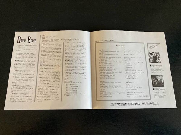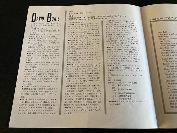 De single “Blue Jean / Dancing With The Big Boys” van David Bowie uit Japan, uitgebracht in 1984. Het gaat hier om de originele (eerste) release van de Japanse single met originele insert van vier pagina’s.