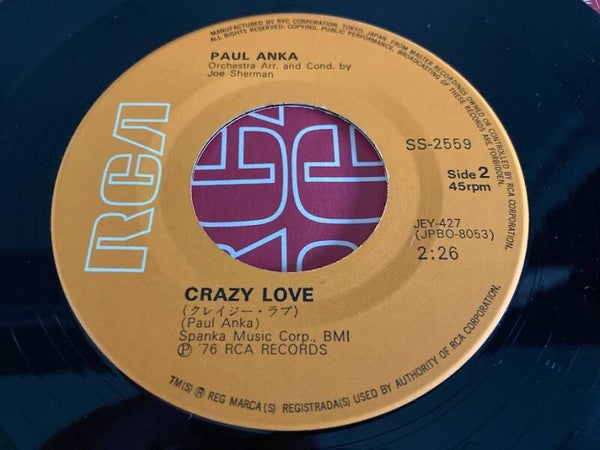 De single “Diana / Crazy Love” van Paul Anka uit Japan, uitgebracht in 1976. Het gaat hier om een re-release van de Japanse single met originele insert.