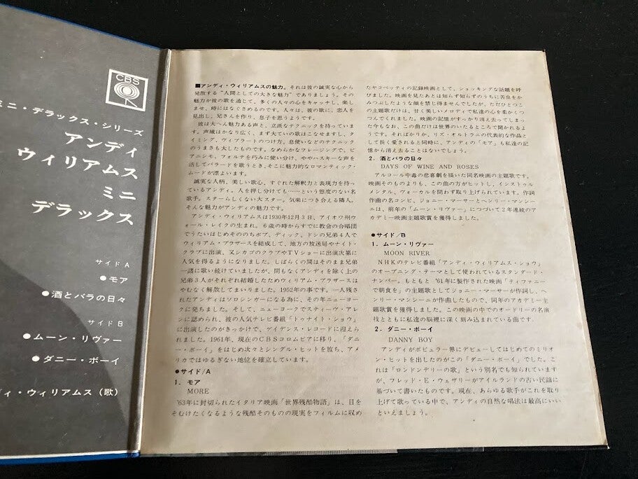 De 7” EP “Mini De Luxe” van Andy Williams uit Japan, uitgebracht in 1966. Het gaat hier om de originele (eerste) release van de Japanse single met fotohoes en insert.