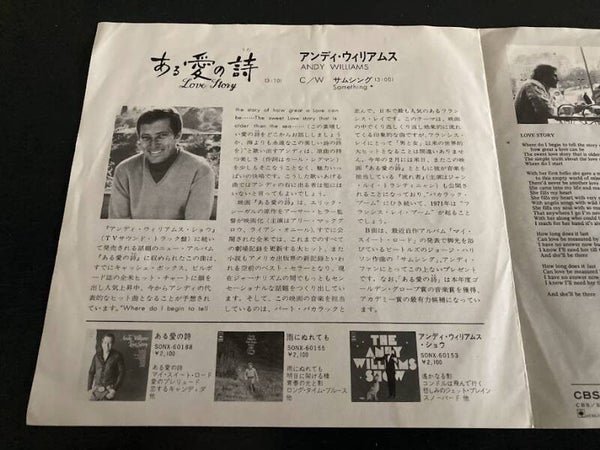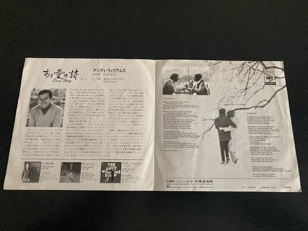 De single “Love Story / Something” van Andy Williams uit Japan, uitgebracht in 1971. Het gaat hier om de originele (eerste) release van de Japanse single met originele insert van vier pagina’s.