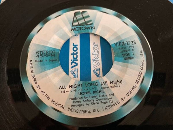 De single “All Night Long / Wandering Stranger” van Lionel Richie uit Japan, uitgebracht in 1983. Het gaat hier om de originele (eerste) release van de Japanse single met originele insert.