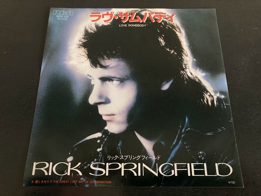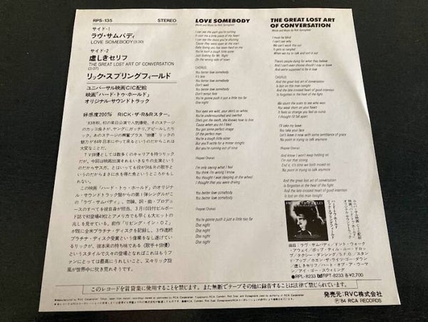 De single “Love Somebody / The Great Lost Art of Conversation” van Rick Springfield uit Japan, uitgebracht in 1984. Het gaat hier om de originele (eerste) release van de Japanse single met originele insert.