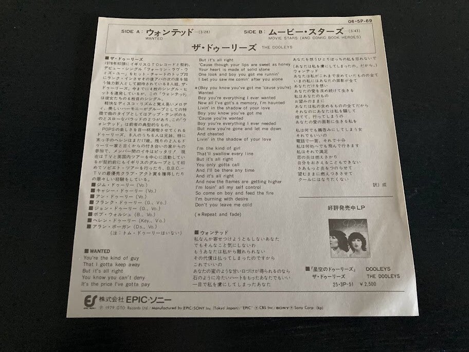 De single “Wanted / Movie Stars” van The Dooleys uit Japan, uitgebracht in 1979. Het gaat hier om de originele (eerste) release van de Japanse single met originele insert.