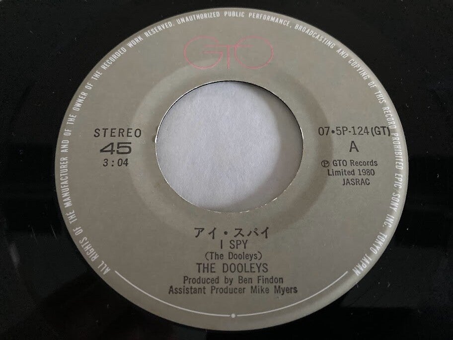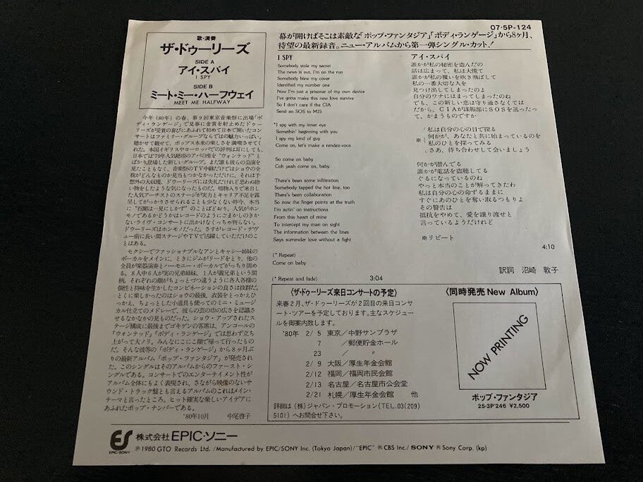 De single “I Spy / Meet Me Halfway” van The Dooleys uit Japan, uitgebracht in 1980. Het gaat hier om de originele (eerste) release van de Japanse single met originele insert.