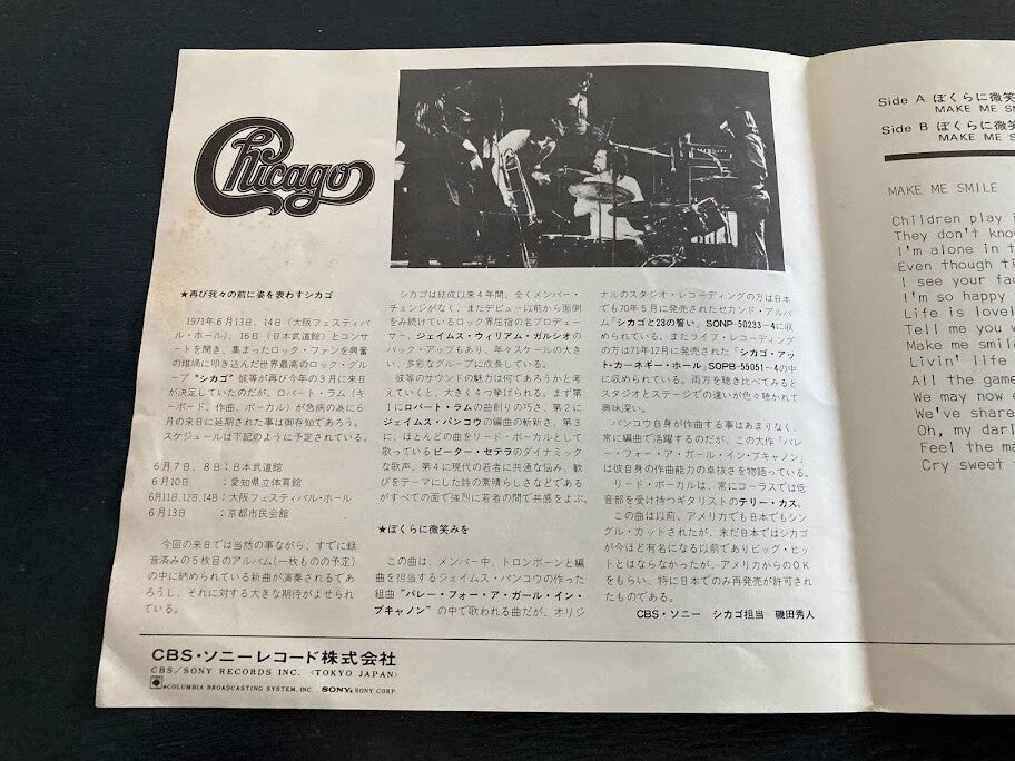 De single “Make Me Smile” van Chicago uit Japan, uitgebracht in 1972. Het gaat hier om de originele (eerste) release van de Japanse single met originele insert van vier pagina’s.
