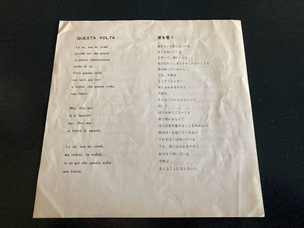 De hoes ziet er nog zeer goed uit. In de hoes zit een insert van vier pagina’s met alle vier songteksten in het italiaans en in het japans. De insert ziet er nog zeer goed uit. Het vinyl zit in een plastic innersleeve en ziet er nog perfect uit.